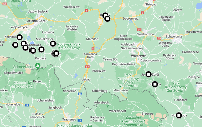 Schmiedeberg, polnisch ist eine Stadt im Powiat Jeleniogórski in Woiwodschaft Niederschlesien in Polen. Sie gehört der Euroregion Neiße an. Die Stadt liegt in Niederschlesien am Fuß des Riesengebirges und des Landeshuter Kamms am Fluss Jedlica (deutsch: Eglitz), einem rechten Nebenfluss der Łomnica (deutsch: Große Lomnitz) etwa 14 Kilometer südöstlich von Jelenia Góra (Hirschberg) und 93 Kilometer südwestlich von Breslau. Schmiedeberg wurde erstmals im Jahr 1355 in einer Urkunde erwähnt, als die im Grenzwald liegende Region im nördlichen Riesengebirge durch deutsche Siedler gerodet wurde.[2] Es gehörte damals zum Herzogtum Schweidnitz, das nach dem Tod des Herzogs Bolko II. 1368 erbrechtlich an Böhmen fiel, wobei Bolkos Witwe Agnes von Habsburg bis zu ihrem Tod 1392 ein Nießbrauch zustand. Hinweise auf eine bereits bestehende ältere Ansiedlung im Gebiet von Schmiedeberg im Zusammenhang mit einem dortigen Erzabbau enthalten Veröffentlichungen von Theodor Eisenmänger aus dem Jahr 1900[3] sowie von Ephraim Ignatius Naso, der im 17. Jahrhundert als Jurist und Historiker in Schweidnitz wirkte.