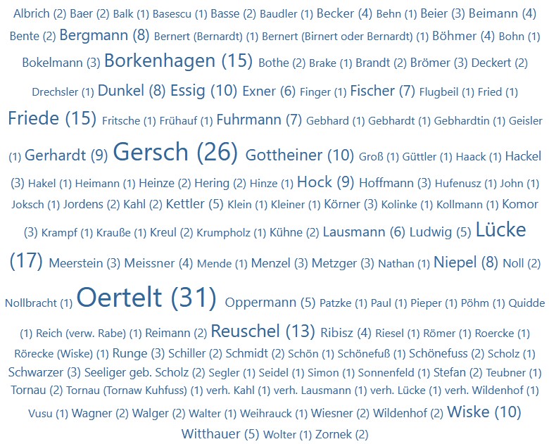 Lücke | Tornau (Tornaw Kuhfuss) | Reuschel | Kettler | Borkenhagen | Oppermann | Essig |Bernert (Bernardt) - Ur-Ur-Ur-Groß-Eltern